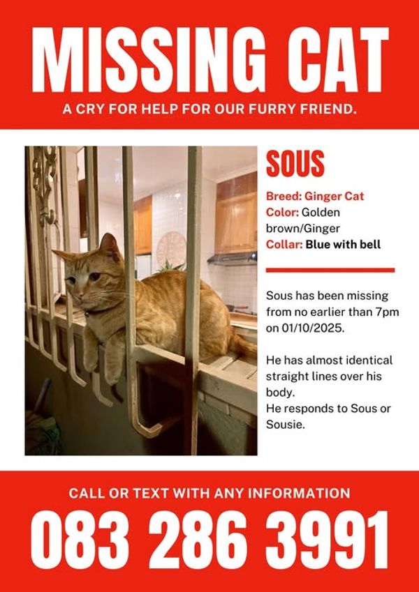 Description: Breed : Ginger Color : Golden Brown/Ginger Collar : Blue with bell